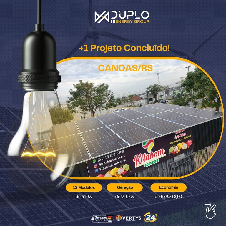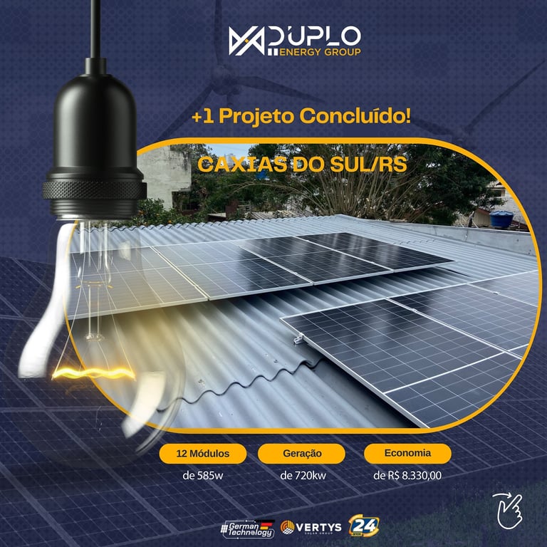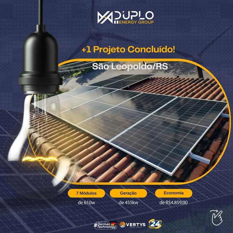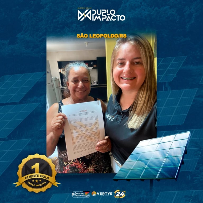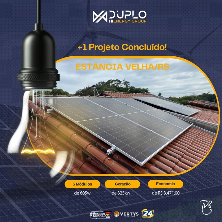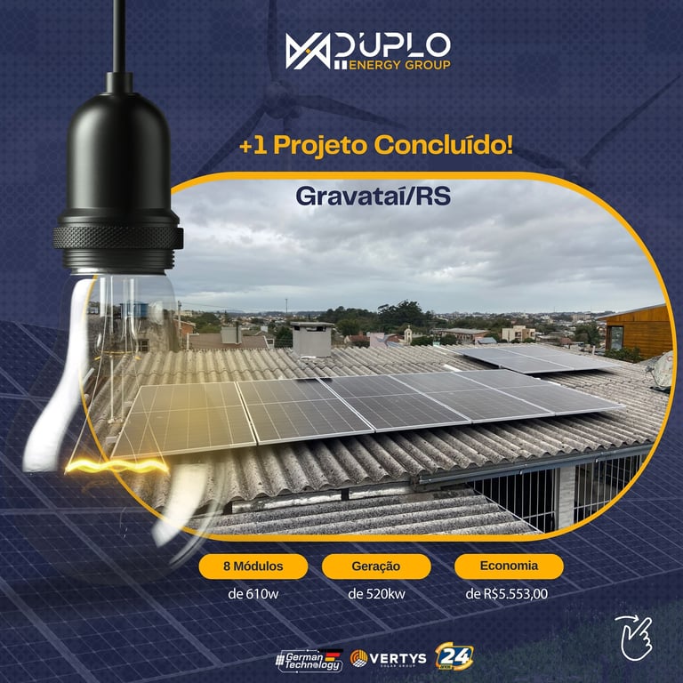 A Duplo Energy Group surge da reformulação da Duplo Impacto Energia Solar no Rio Grande do Sul, onde já instalamos mais de 1.000 usinas. Essa mudança reforça nossa evolução e expansão no setor energético. Mais do que economia na conta de luz, entregamos impacto real em soluções sustentáveis. Agora, além da energia solar fotovoltaica, oferecemos crédito de carbono, energia renovável a custos reduzidos, consultoria em homologações, climatização inteligente, carregadores para veículos elétricos e mobilidade sustentável. Com inovação e tecnologia, transformamos o futuro da energia, garantindo mais economia, sustentabilidade e eficiência para empresas e residências.